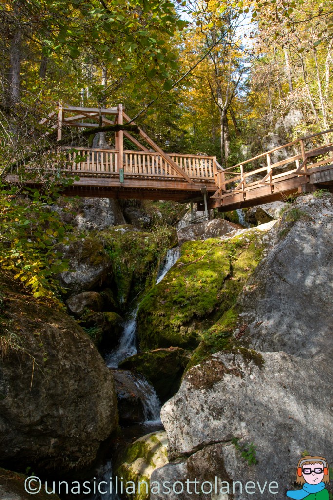 Normalmente durante una escursione in un klamm si cammina su dei ponti di legno attaccati alla parete con il fiume che vi scorre sotto di voi e la cascata proprio accanto. Difatti sono molto ‘bagnati’ come percorsi ma anche unici.